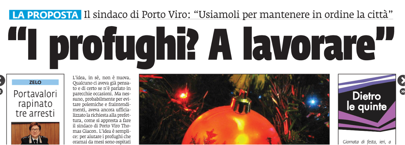 Oppure questo titolo della Voce di Rovigo di un anno fa: “I profughi? A lavorare”. La notizia: il sindaco di Porto Viro voleva coinvolgere i profughi ospiti nel suo comune in attività socialmente utili, ad esempio lo sfalcio del verde o piccole manutenzioni in città. Il titolo, si sa, deve riassumere. Però qui rivela una visione del mondo. “Quei fannulloni dei profughi vadano a lavorare”. A lavorare come e dove? “Gratis”. Anzi: “usiamoli”. Come si fa con la servitù.