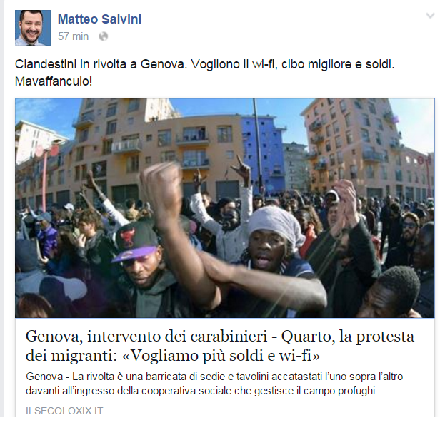 La questione dell’uso disinvolto delle immagini è sempre d’attualità. Sul web, ormai, gira di tutto. Sempre oggi, il leader della Lega Nord, Matteo Salvini, posta su Facebook l’ennesima intemerata contro i “profughi”, di cui riporto il significativo screenshot.