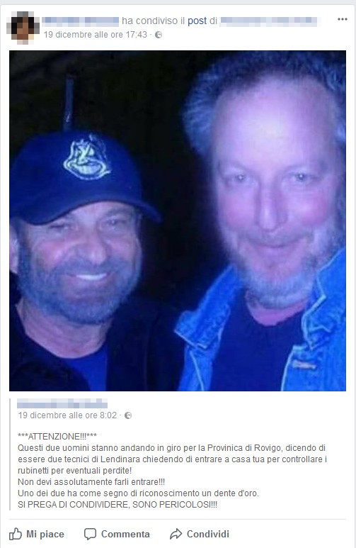 Generalmente, quando vedo un post di questo tipo, sento puzza di bufala. Guardando la fotografia, poi, divento ancora più sospettoso: in quale momento, esattamente, i due schifidi truffatori si sarebbero messi in posa per un selfie? Come ha fatto l’autore dell’allarme a venire in possesso della foto? In che modo ha associato il tipo che “ha come segno di riconoscimento un dente d’oro” a uno dei due ritratti nella foto? Sono domande rapide rapide, mica frutto di mezzora di scervellamenti.