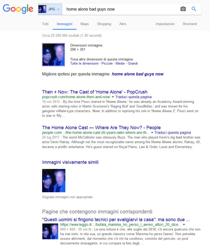 Si scopre che, prendendo per oro colato la notizia, i due starebbero girando per le provincie di Roma, Napoli, Perugia, eccetera, eccetera. Si scopra anche che, a ben guardare, i due sono Joe Pesci e Daniel Stern, attori che nel film “Mamma ho perso l’aereo!” recitavano la parte di due ladri.