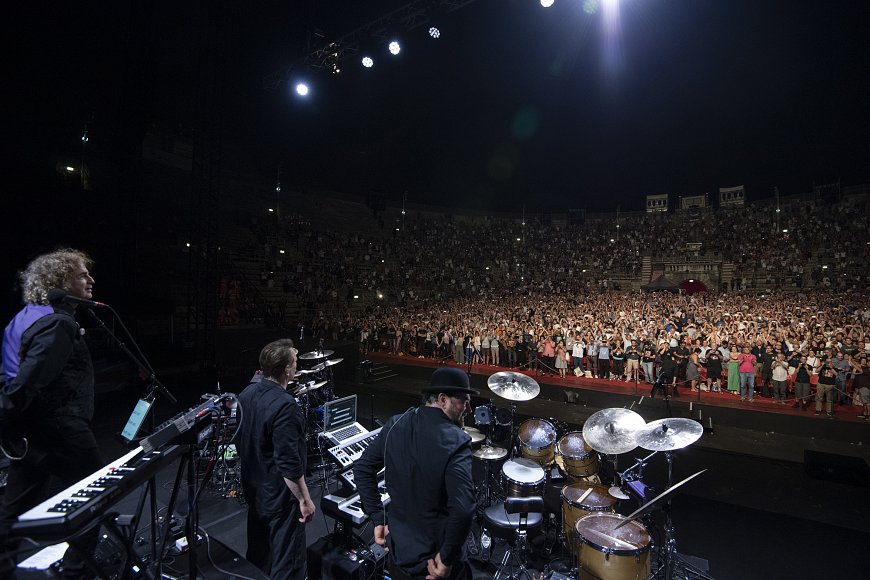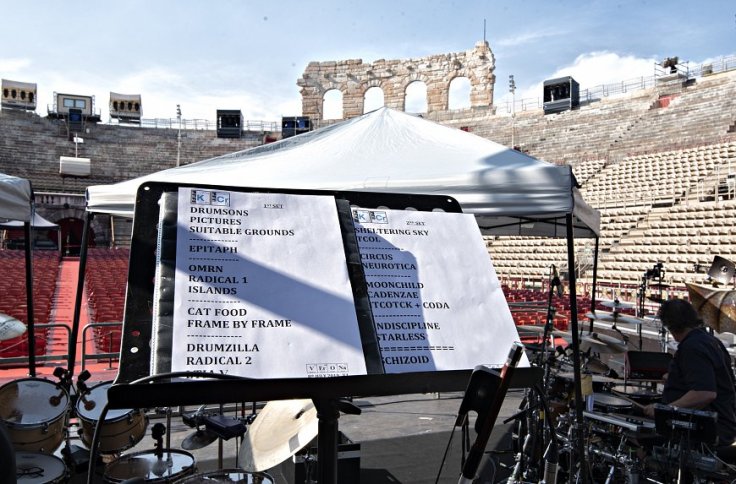 Vicino a me, lassù tra le scalinate dell’arena, c’è un tizio gasatissimo, che all’attacco del concerto già si sbraccia a mimare i colpi delle bacchette sui tom e sui rullanti, simula con la voce i riff ruggenti delle chitarre e soprattutto scola birre come non ci fosse un domani: a metà concerto ne ho contate cinque o sei. Arriverà verosimilmente alla decina a fine serata, intorno a mezzanotte. Naif, tutto quello che volete, ma mille volte meglio di quelli che passano il concerto a filmare con il cellulare. Tanto qui fare le foto (e fumare), come sempre ai concerti dei King Crimson, è verboten.
