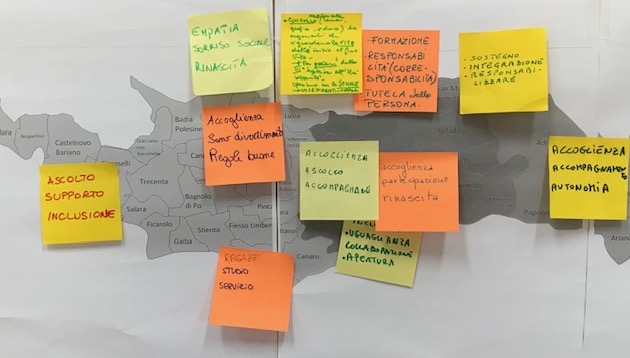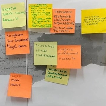 Nel primo incontro, dunque, non abbiamo nemmeno acceso un proiettore. Ci siamo affidati al classico cartellone e ad una quantità di post it colorati. Abbiamo dedicato un po’ di tempo alla scelta delle parole per descrivere i progetti, giocando un po’ tra riflessione seria e provocazione. Cercando quella via di mezzo tra la “fuffa” (l’eccessiva astrazione, l’enfasi sui valori) e la concretezza, la chiarezza.