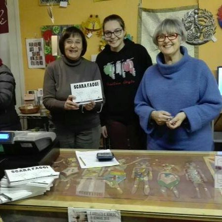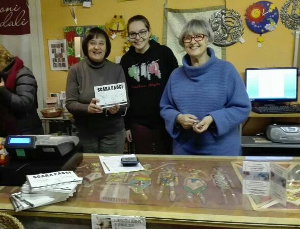 Qui sotto la consegna nelle mani di Carla Pavan, qui affiancata dall’amica Christina Garczick (anche lei a lungo attiva in Emergency Rovigo). Di fianco, nell’espositore in mezzo a libri sul consumo critico e la cucina veg: avrà forse indotto in errore qualche distratto acquirente, convinto di prendere un libro di ricette a base di insetti? Chissà!