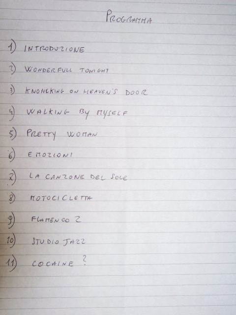 (…) Unica testimonianza scritta di questi anni oscuri è la scaletta del concerto del 28 novembre 1999, naturalmente al centro giovanile Don Bosco a Sarzano, paese di Gianni e luogo di adozione di Mario, entrambi attorissimi della compagnia Teatro Insieme.