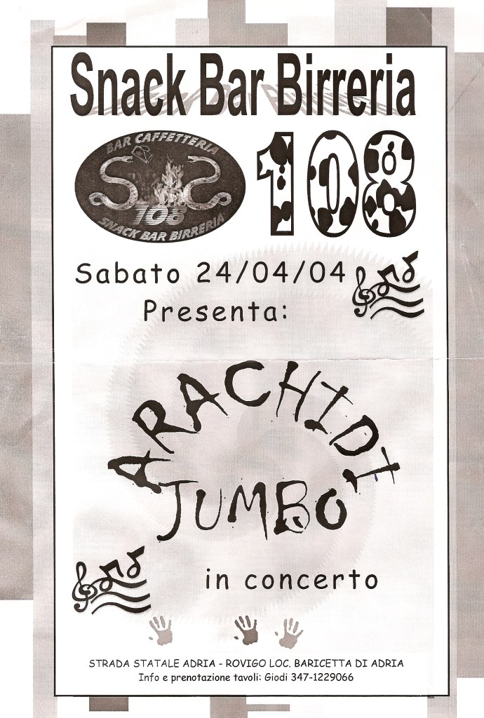 Ormai del tutto rodati a quintetto, gli Arachide tornano a esibirsi in pubblico il 24 aprile 2004, suonando di fronte al pubblico del bar / caffetteria / snack bar / birreria “108” nella ridente località di Baricetta, per la precisione sulla statale tra Adria e Rovigo.