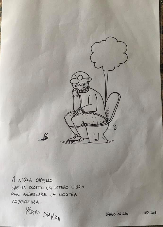 Sia come sia, qui sotto potete ammirare lo schizzo nudo e crudo e spiegazzato, scarabocchiato nel luglio 2019, che abbiamo poi regalato a Nicola Cappello (si vede sotto una simpatica dedica).