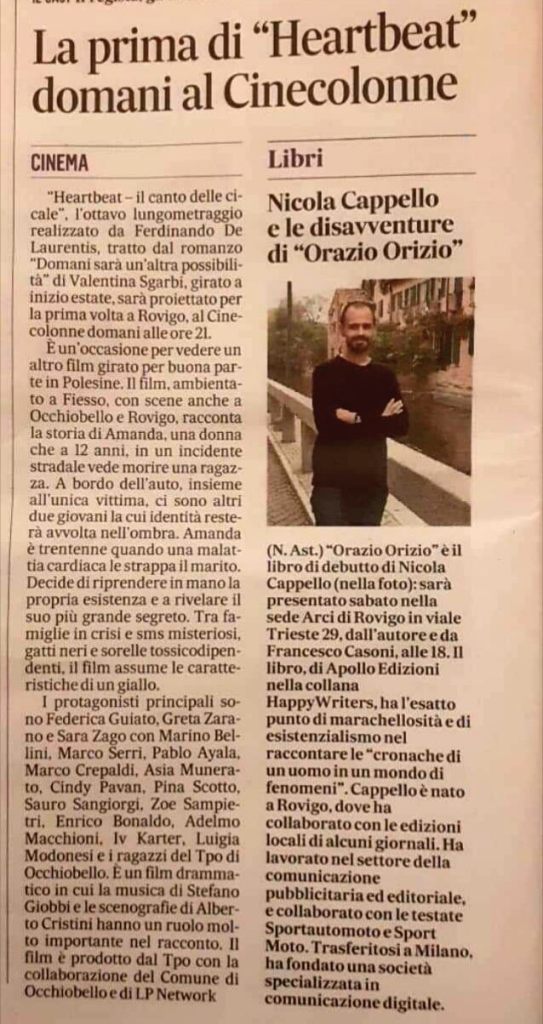 Si tratta, invece, del romanzo di un amico, Nicola Cappello, che nell’ottobre 2019 ha dato alle stampe il suo “Orazio Orizio. Cronache di un uomo in un mondo di fenomeni” (Apollo edizioni).