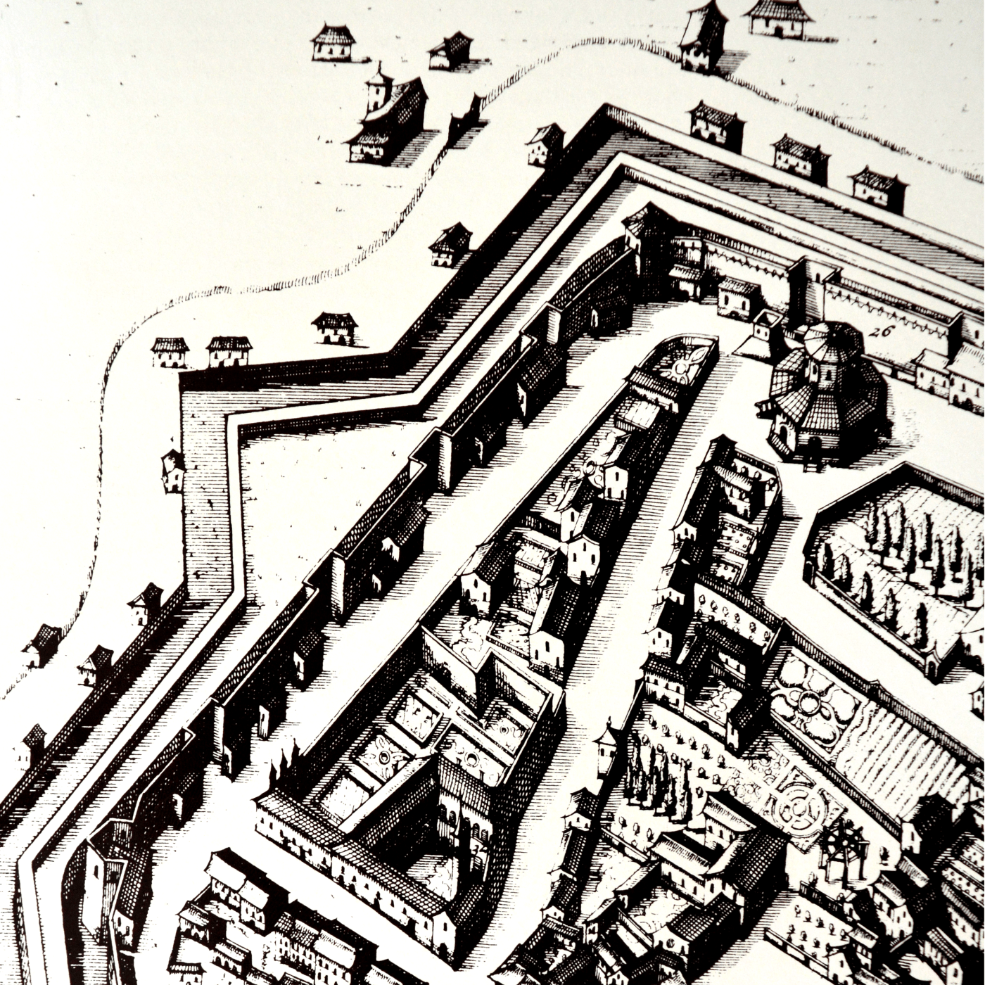 Immaginate un quartiere con case perlopiù basse, a ridosso della cinta muraria. Un grande convento, con la chiesa, il tipico campanile a cuspide, piccole casette semplici addossate alle mura, il vallo medievale, appezzamenti di terreno coltivati, orti, alberi.