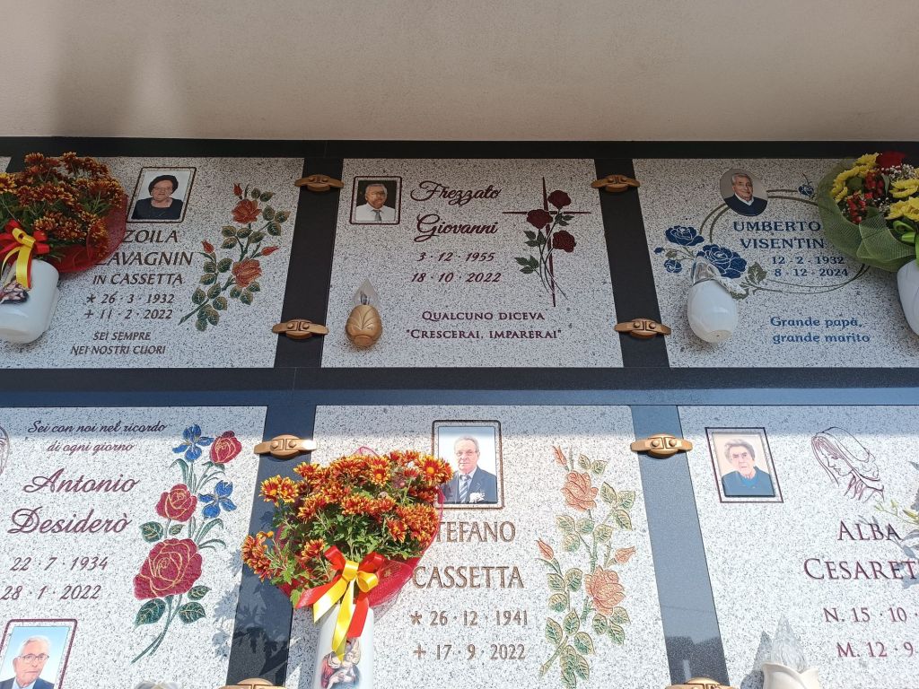 La tomba di Gianni Frezzato è nel cimitero di Beverare, appena entrati. Il saluto dice: “Qualcuno diceva: crescerai, imparerai“. O in alternativa: ciao, bbellu.
