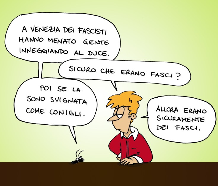 Così, per qualche mese, sul Manifesto escono coloratissime vignette di omini e scarafaggi, che discettano dei fatti del giorno.